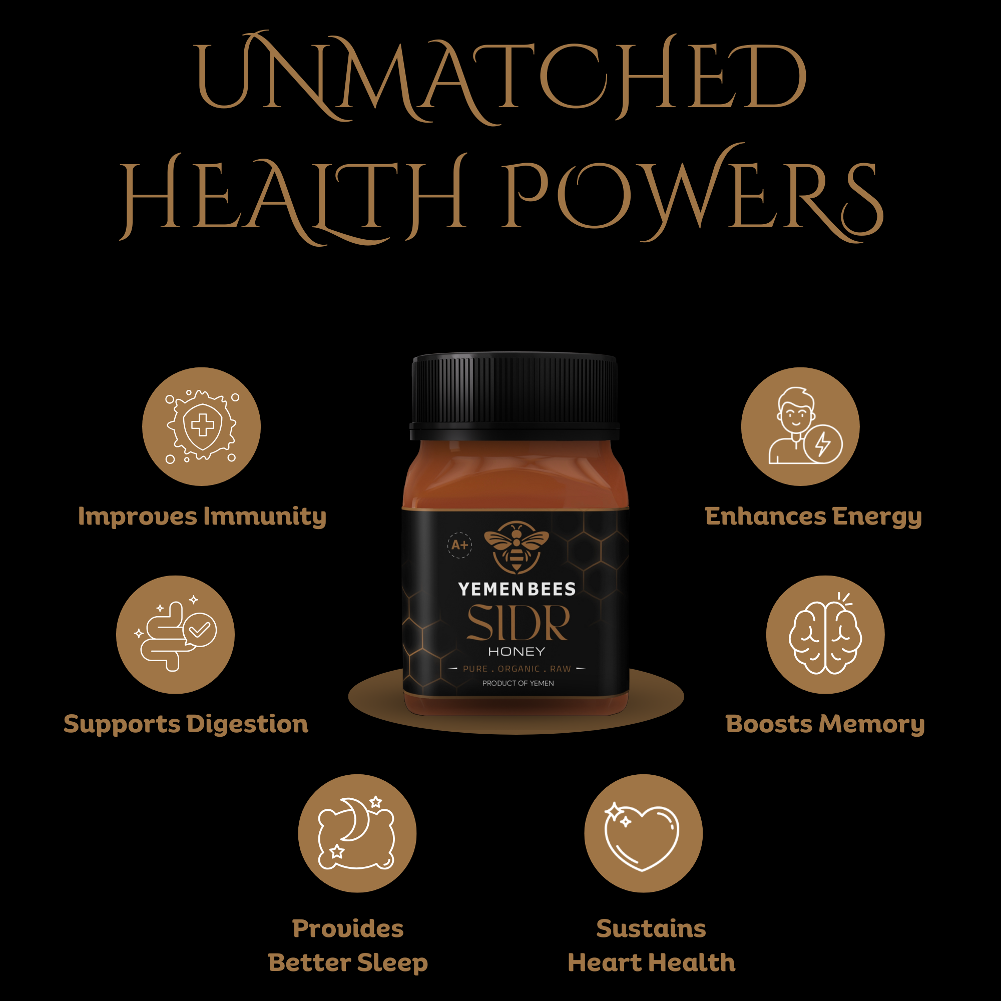 Yemeni Sidr honey has been treasured for centuries as one of nature’s most powerful natural foods. Harvested from the nectar of the rare Sidr tree in the pristine valleys of Yemen, this honey is known for its exceptional purity, rich nutrients, and remarkable strength. It naturally supports energy, helps strengthen the body, and has long been valued in traditional wellness practices. Each spoonful is thick, aromatic, and deeply nourishing — a true taste of nature’s finest craftsmanship. This is more than honey; it’s a rare gift from Yemen’s untouched landscapes.